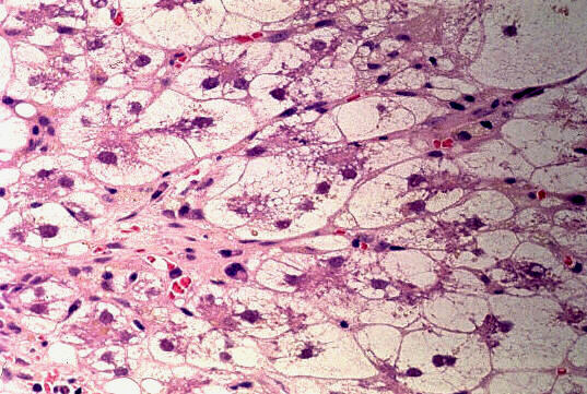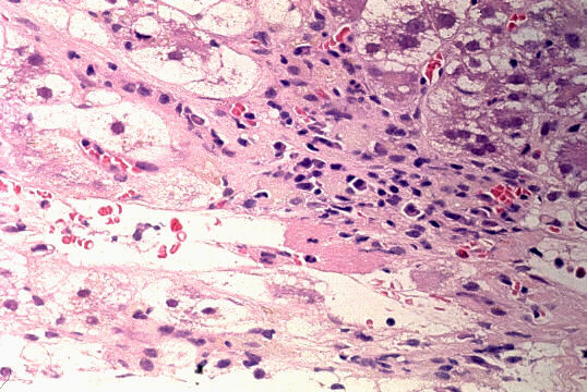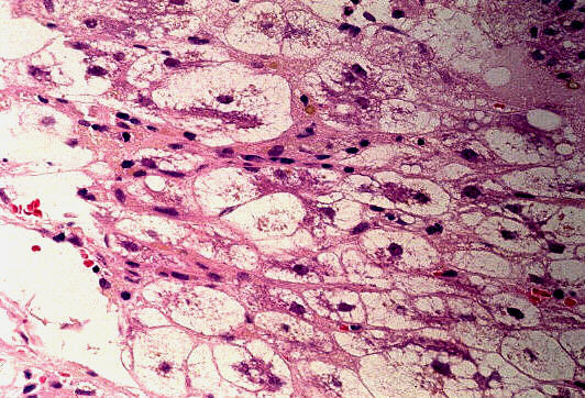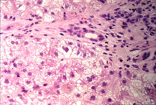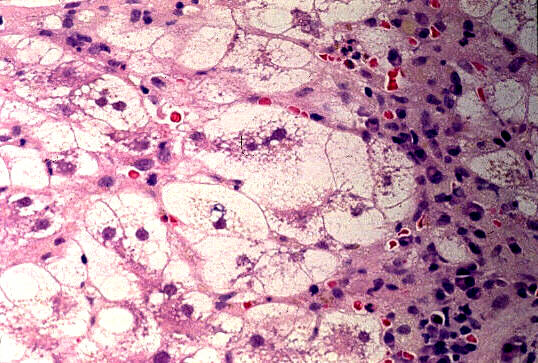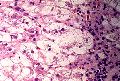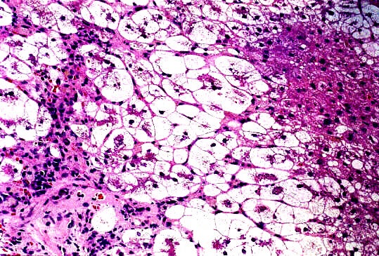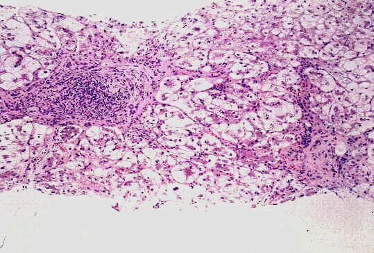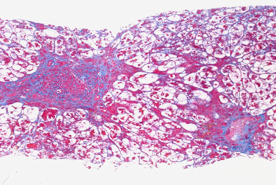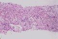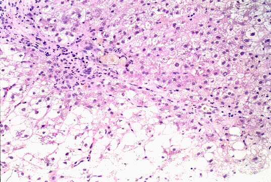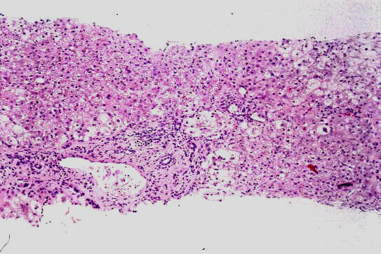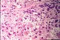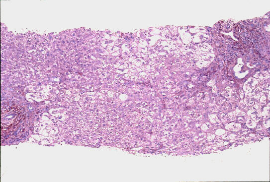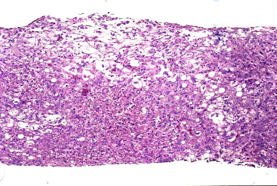 - 実質域;架橋形成性壊死 (bridging hepatic necrosis)、肝細胞の風船様膨化と再生性肝細胞、小ないし中滴性脂肪沈着を部分的にみる、羽毛状変性と風船様膨化、合胞性多核巨細胞の出現、ロゼット形成(偽腺管構造)、胞体内凝集傾向、核内空胞