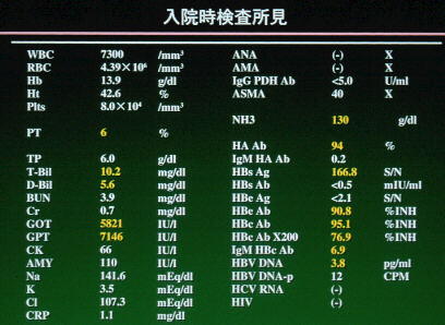 現病歴:1997年7月1日より、感冒様症状があり、7月6日より褐色尿を認め、7月10日にT病院を受診。当日の血液検査にて、GOT 8800、GPT 7990、LDH 7080、ALP 943、γ‐GTP 92、T-Bil 7.3、D-Bil 4.6と著明な肝機能障害を認めたため入院となった。7月11日の血液検査では、GOT 6940、GPT 7460、LDH 3650、ALP 965、γ‐GTP 98、T-Bil 9.2、D-Bil 5.1、PT 11%、アンモニア156μg/mlと黄疸の増悪と凝固因子の低下を認め、劇症肝炎への進行を考慮し、7月11日に当院に転院となった。今までの献血では、HBV/HCVの指摘を受けたことはない。過去数ヶ月以内にHBVキャリアー(HBsAg+、HBsAb-,HBeAg-、HBeAb+、HBcAb+)とSexual contactがあったという。