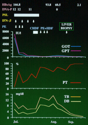 入院時、肝性昏睡II度を呈し、PT 6%と低値であり、B型の劇症肝炎と診断した。ステロイドパルス療法(1000mgから開始し漸減)、IFN-βの投与(3MU x4回)を、肝不全に対して、血症交換(PE)3回、血液濾過(HD)4回施行したところ、肝炎は沈静化し、肝機能は改善した。1997年8月21日肝生検を施行した。